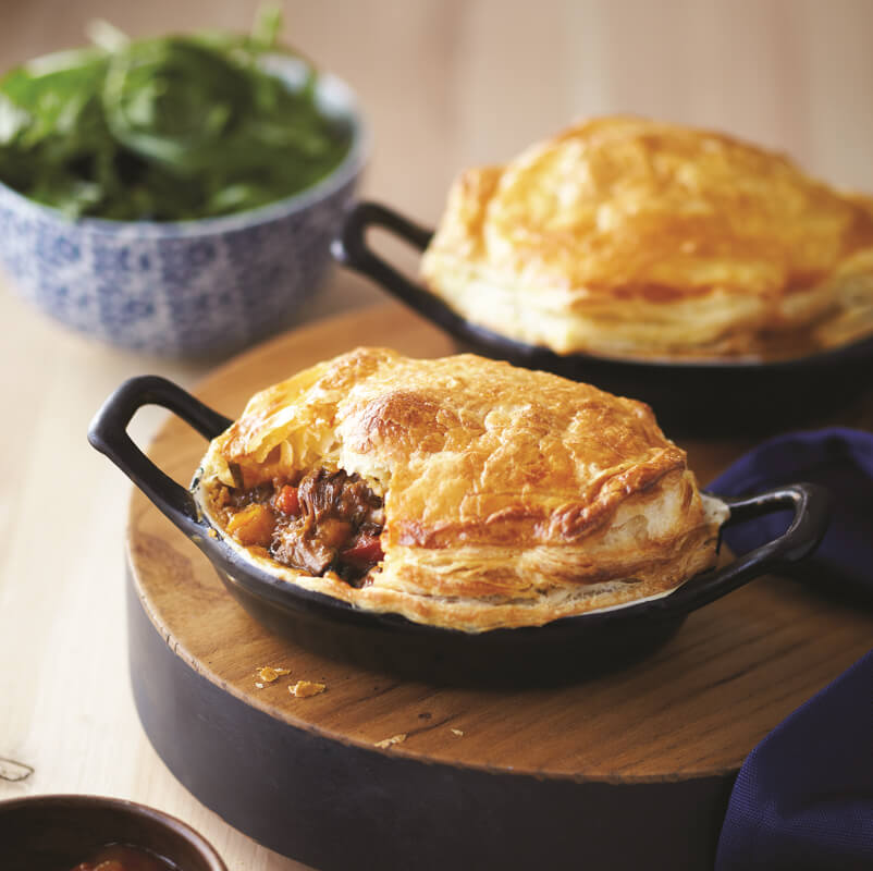 “Every country has their version of street food,” says Lambert. “Our version would be meat filling in pastry, which is sold everywhere as a quick lunch or snack.” Traditionally, meat pies and rolls were made with steak and ground beef, but now there are variations that include flavor profiles like Thai curry or Indian butter sauce. For a party menu, mini meat pies are an easy appetizer with a flaky, buttery crust.